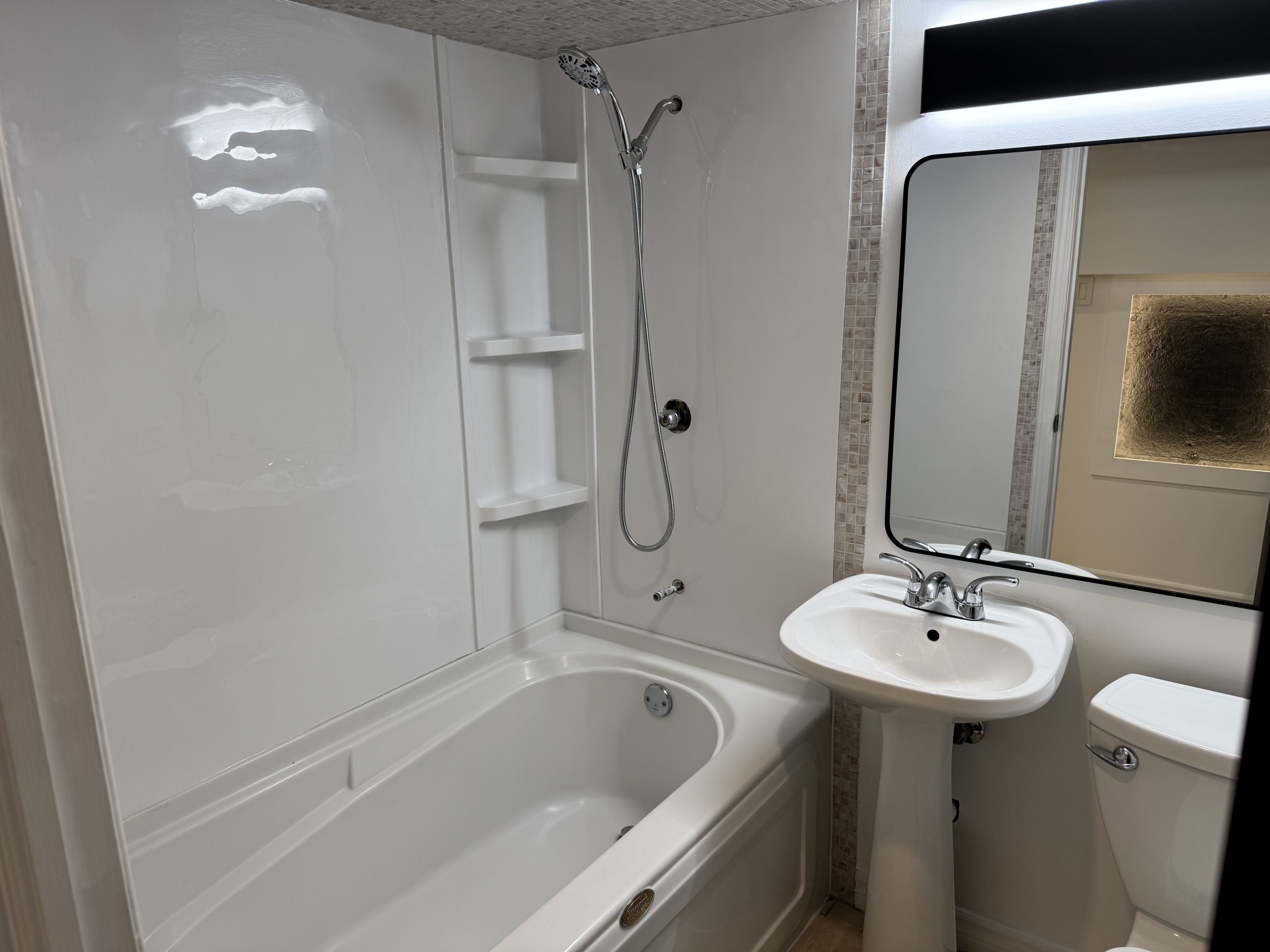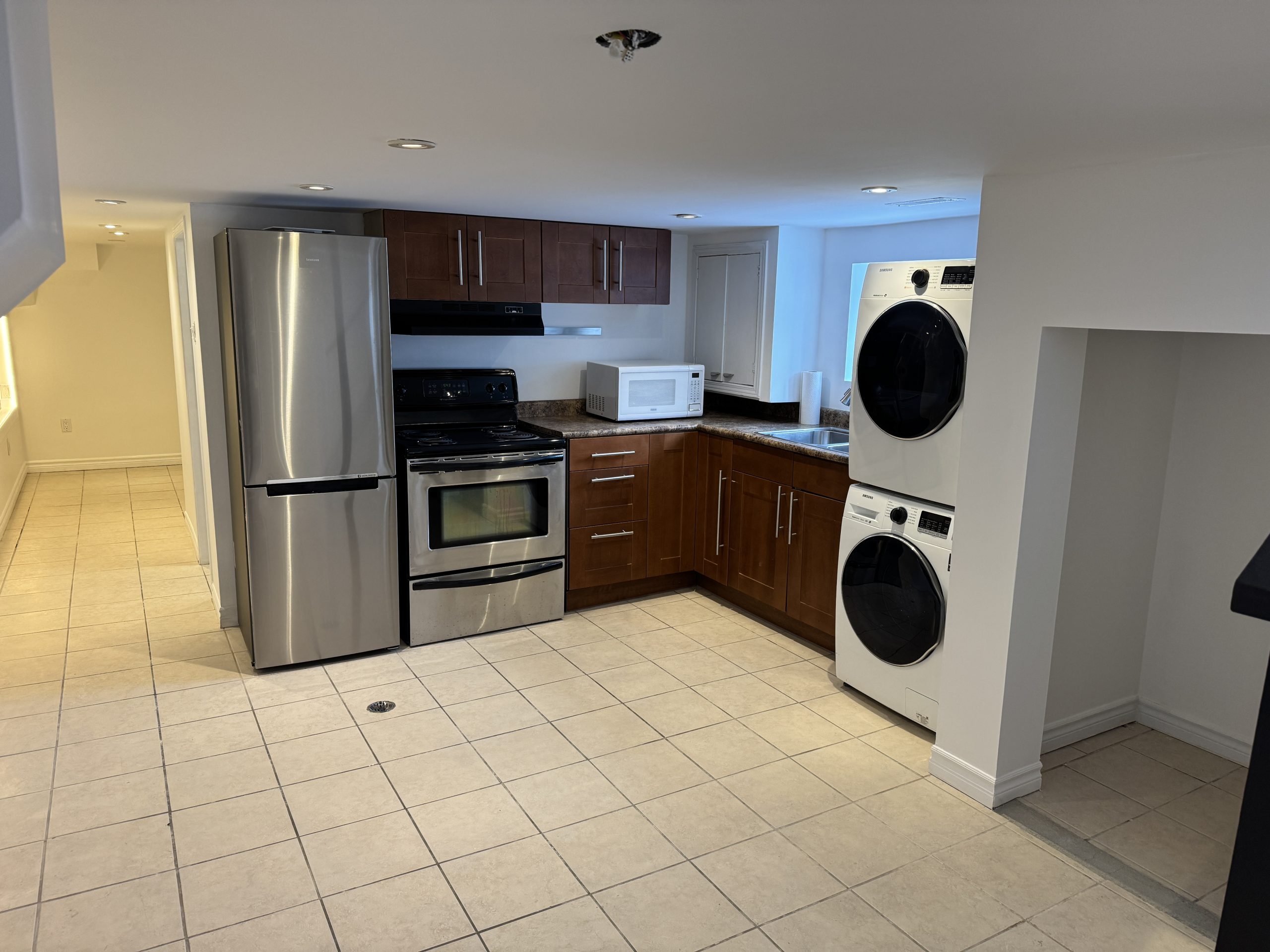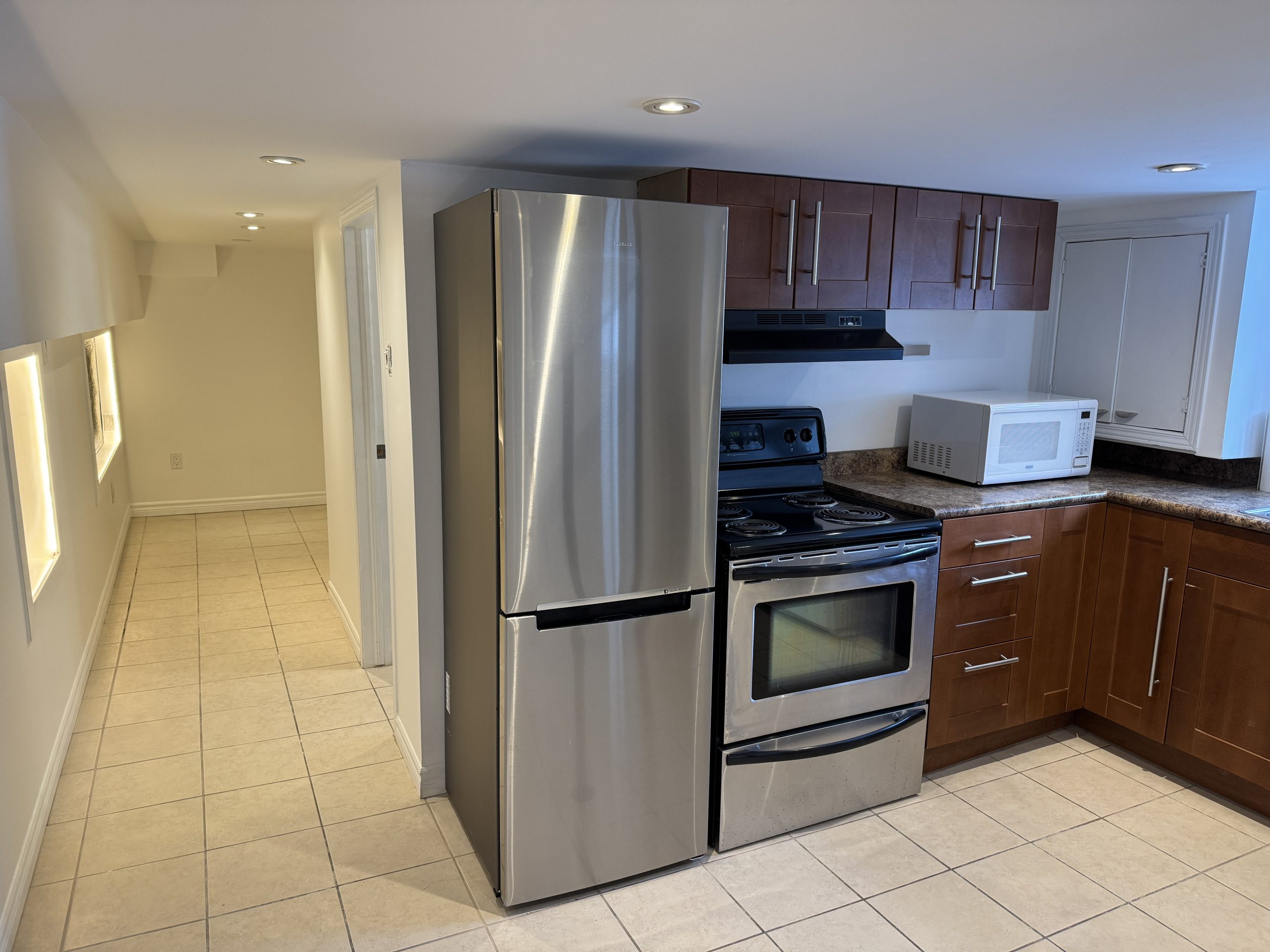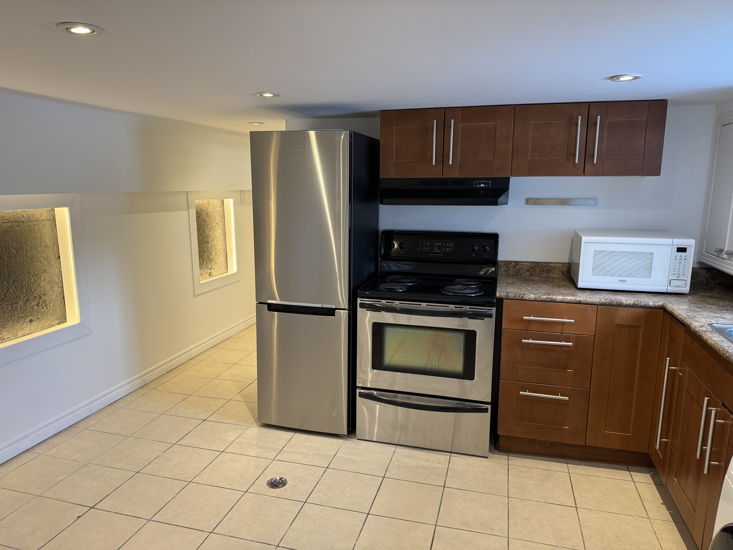 Located at 2A Tiverton Avenue (Dundas/Logan) this partially above ground Jr 1 bedroom basement apartment has a unique open concept layout and is approximately 600 sq ft with a ceiling height of 6’5″. Complete with stainless steel appliances in a beautiful kitchen with ample cabinet storage,  gorgeous modern tiled bathroom, spacious living area with central air; this chic and stylish suite is everything you desire!